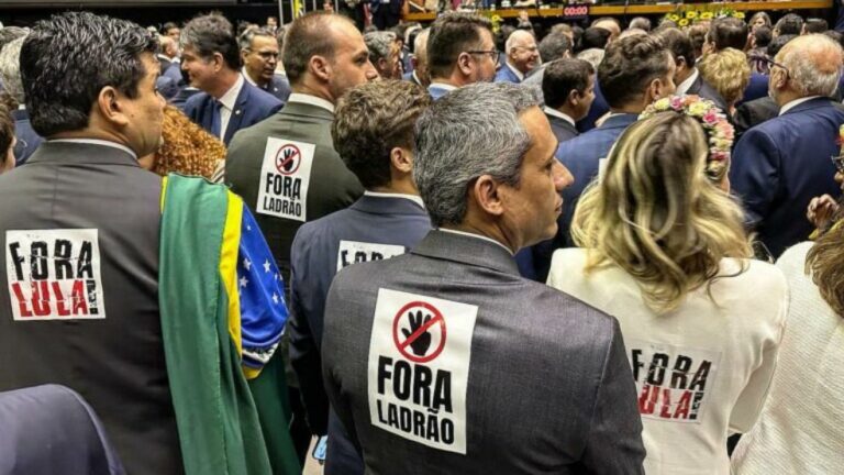 Durante cerimônia de posse no plenário da Câmara dos Deputados, parlamentares do Partido Liberal (PL) já mostraram que a oposição ao governo Luiz Inácio Lula da Silva (PT) será forte. Os políticos colaram cartazes nas costas com as frases “Fora Lula” e “Fora Ladrão”.
