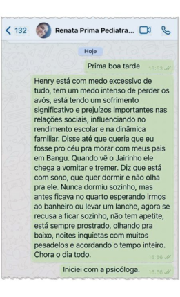 Às 16h53 do dia 18 de fevereiro, a professora então escreveu para a pediatra: “Henry está com medo excessivo de tudo, tem um medo intenso de perder os avós, está tendo um sofrimento significativo e prejuízos importantes nas relações sociais, influenciando no rendimento escolar e na dinâmica familiar. Disse até que queria que eu fosse pro céu pra morar com meus pais, em Bangu”.