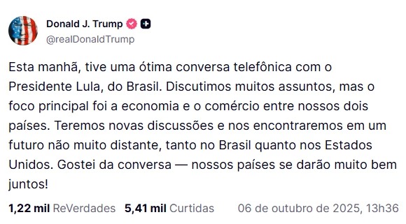 Em publicação na Truth Social, o republicano confirmou que discutiu especialmente economia e comércio bilateral, e prometeu se reunir “em um futuro não tão distante” com o brasileiro “tanto no Brasil, como nos EUA”.