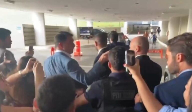 O senador também mandou beijos à manifestante e fez sinal de coração com as mãos enquanto ela protestava. Diante da situação, Flávio precisou ser escoltado até o veículo por seguranças e pela Polícia Militar.