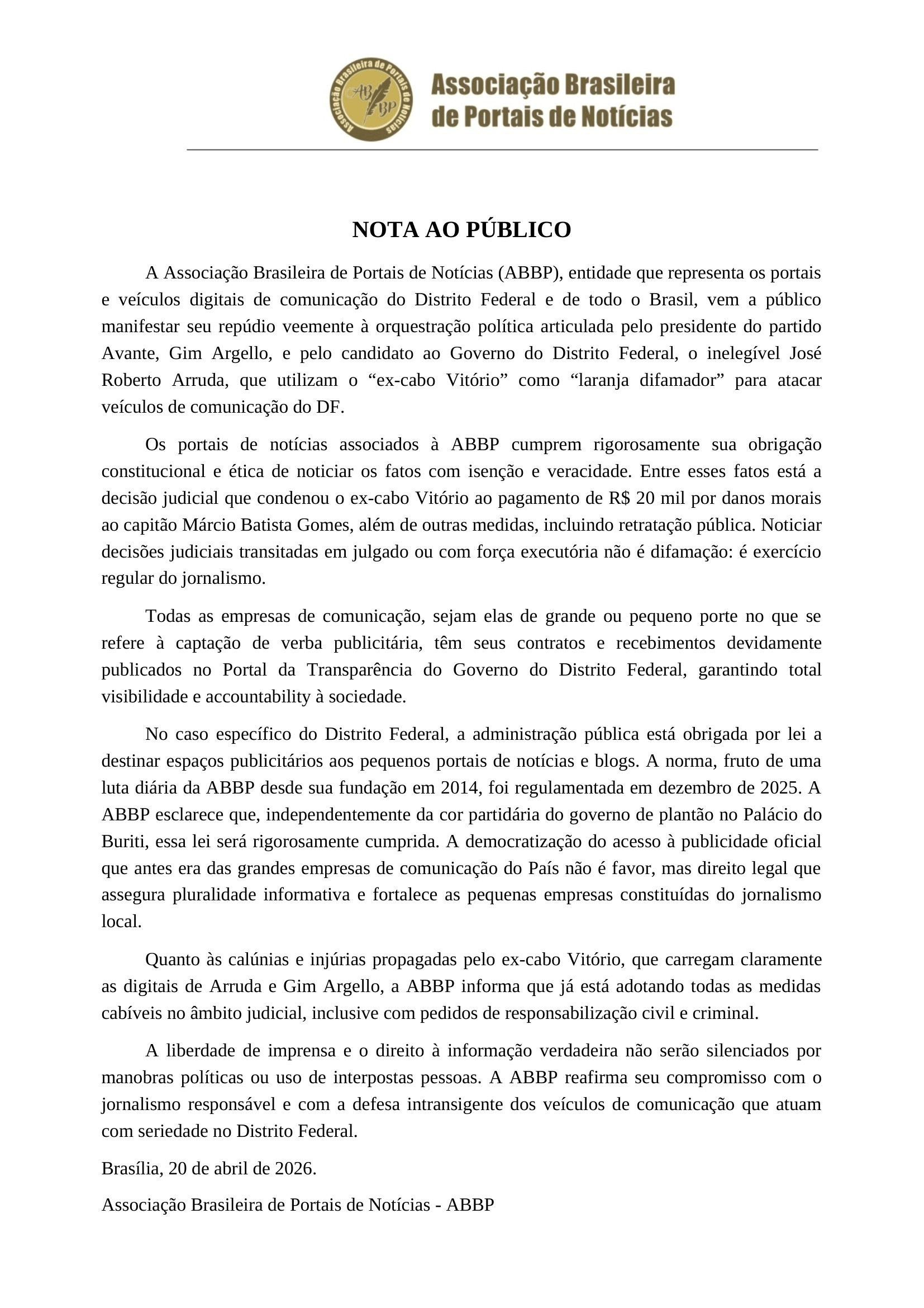 Nesta segunda-feira (20/04), a Associação Brasileira de Portais de Notícias (ABBP) divulgou uma nota pública em que se manifesta sobre ataques dirigidos a veículos digitais de comunicação do Distrito Federal e informa que já adotou providências na esfera judicial. No documento, a entidade cita nominalmente Gim Argello, José Roberto Arruda e o ex-cabo Vitório.