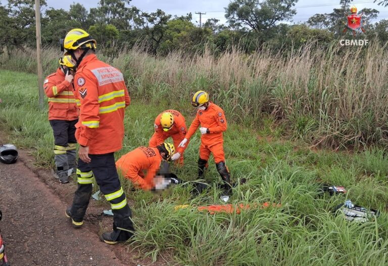 O Corpo de Bombeiros Militar do Distrito Federal (CBMDF) foi acionado e enviou três viaturas de resgate ao local. Ao chegarem, os socorristas encontraram uma motocicleta Honda CB preta e um GM Celta, também preto, envolvidos no acidente.