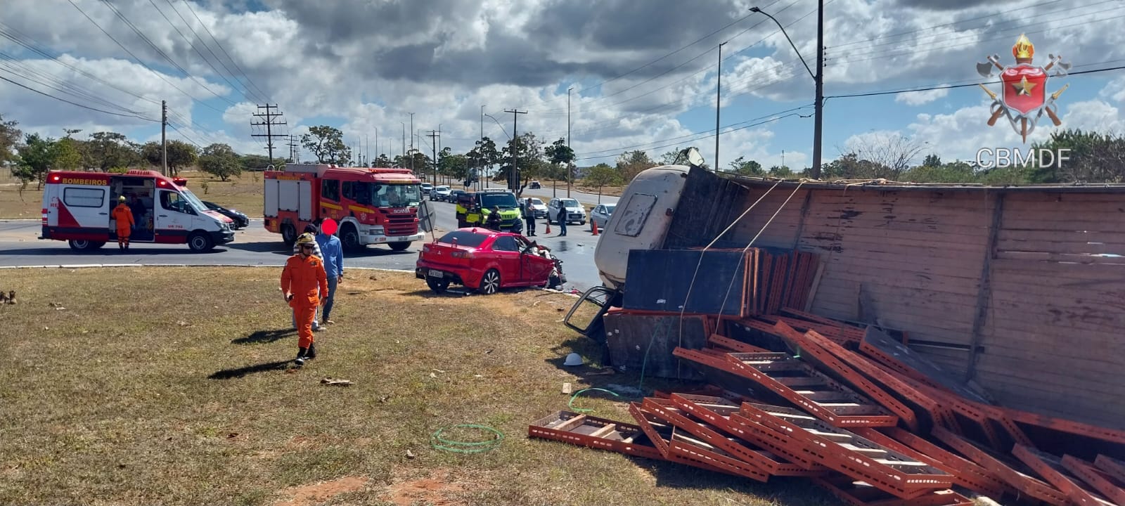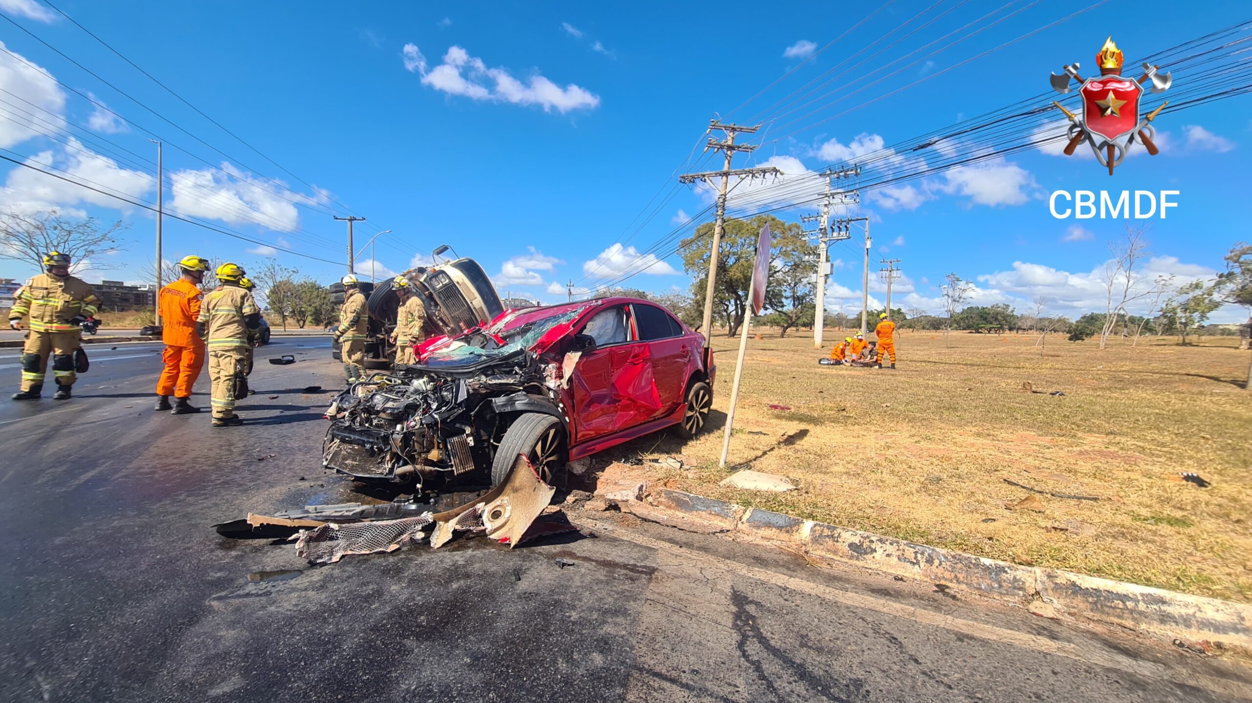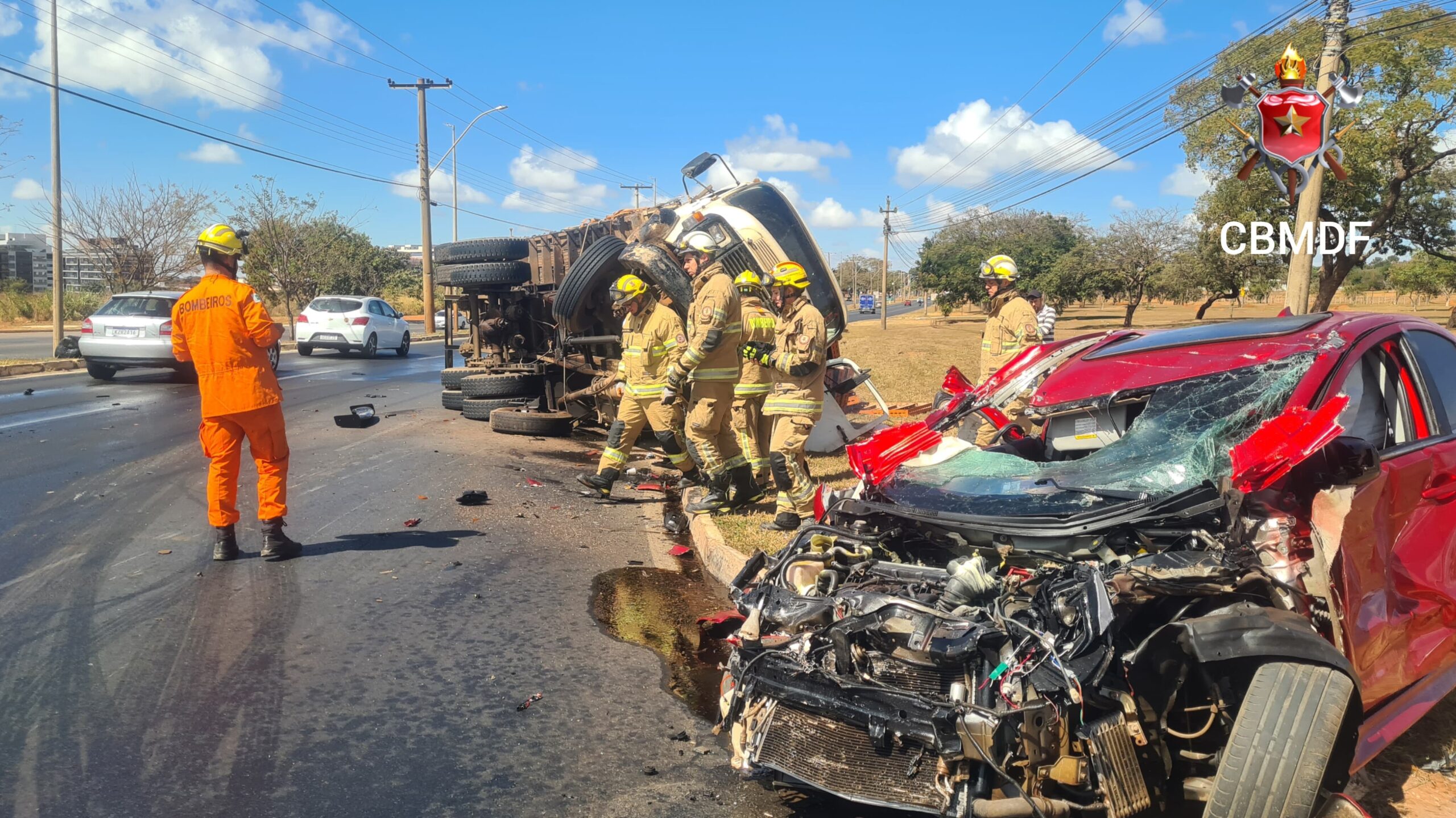 Segundo o Corpo de Bombeiros Militar do Distrito Federal (CBMDF), a equipe de socorro deparou-se com o veículo de passeio MMC Lancer 2.0, de cor vermelha, conduzido por um homem de 31 anos, que havia colidido contra o caminhão M. Benz L1113, de cor branca, conduzido por um homem de 29 anos. Os condutores, do carro e do caminhão, além de um passageiro do carro, de 31 anos, foram avaliados pelos socorristas e não houve necessidade de atendimento hospitalar.