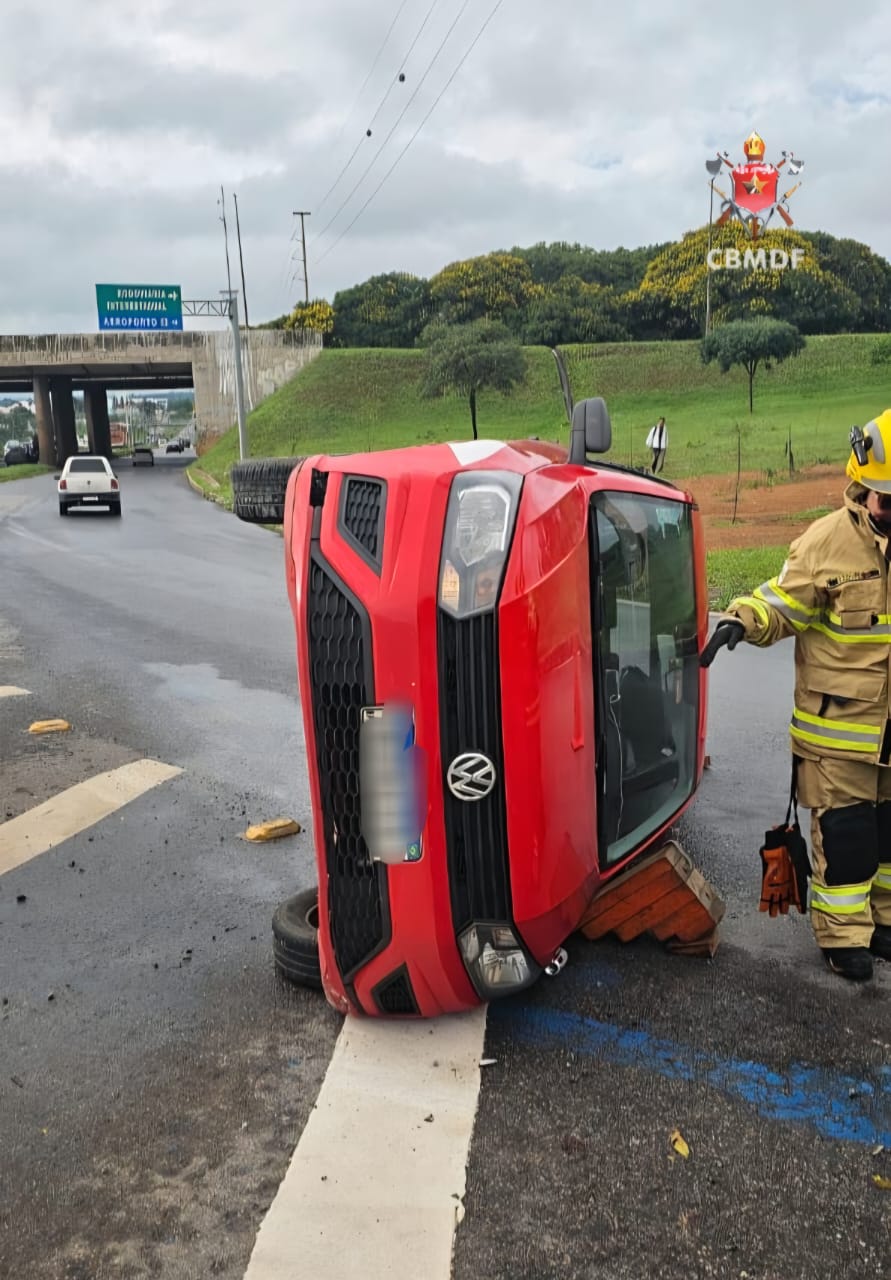 De acordo com o Corpo de Bombeiros Militar do Distrito Federal (CBMDF), o acidente aconteceu por volta das 7h25. Quando as equipes chegaram ao local, encontraram um VW Gol vermelho já tombado na pista. Duas pessoas estavam no interior do veículo no momento do capotamento.