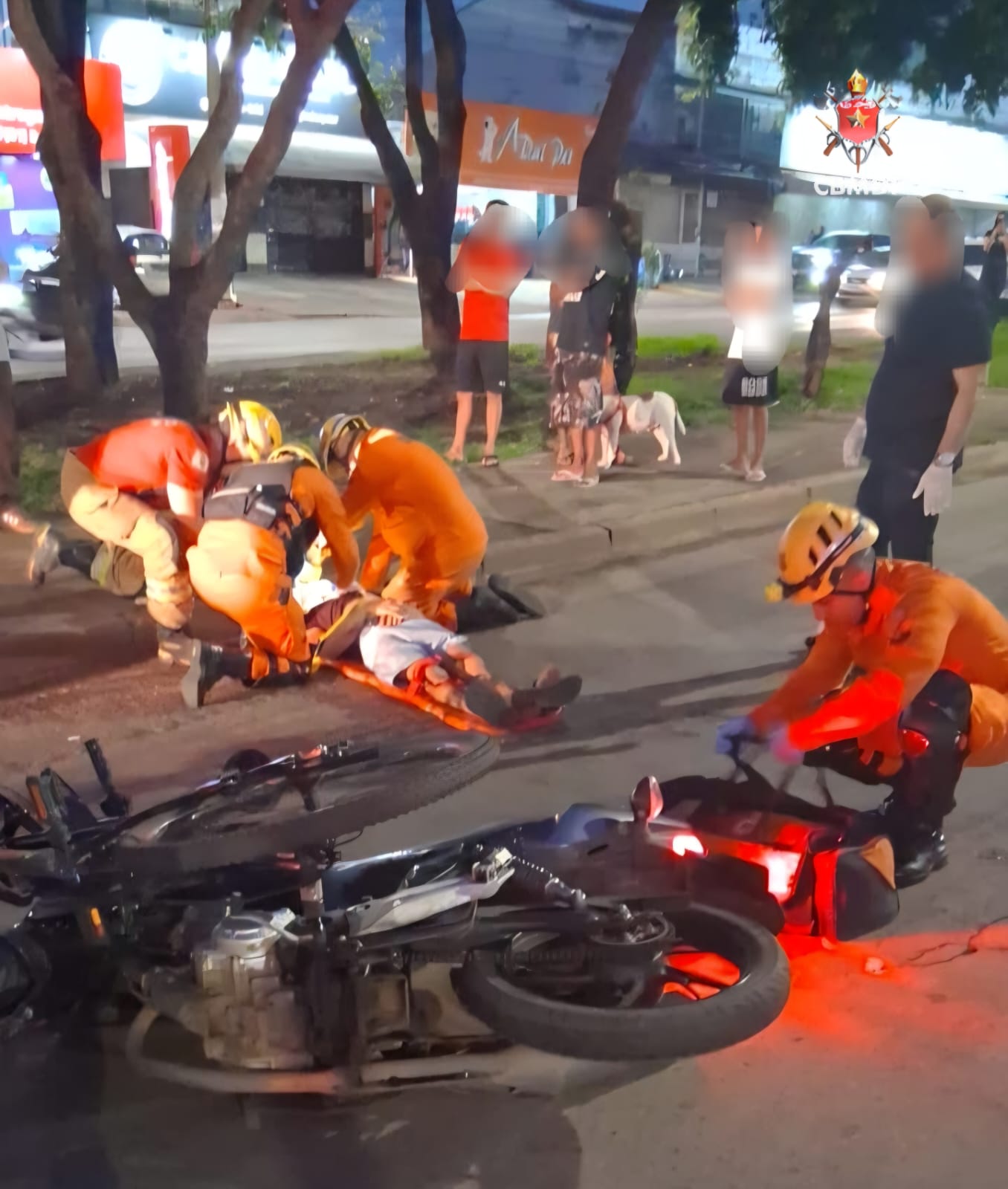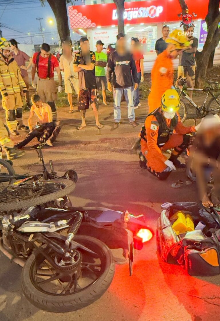 A ocorrência foi atendida pelo Corpo de Bombeiros Militar do Distrito Federal (CBMDF), que deslocou quatro viaturas para o local. Quando as equipes chegaram, encontraram o condutor de uma motocicleta Honda CG 160 Fan, de cor cinza, e o ciclista caídos ao solo, ambos conscientes e orientados, porém com queixas de dor decorrentes do impacto.