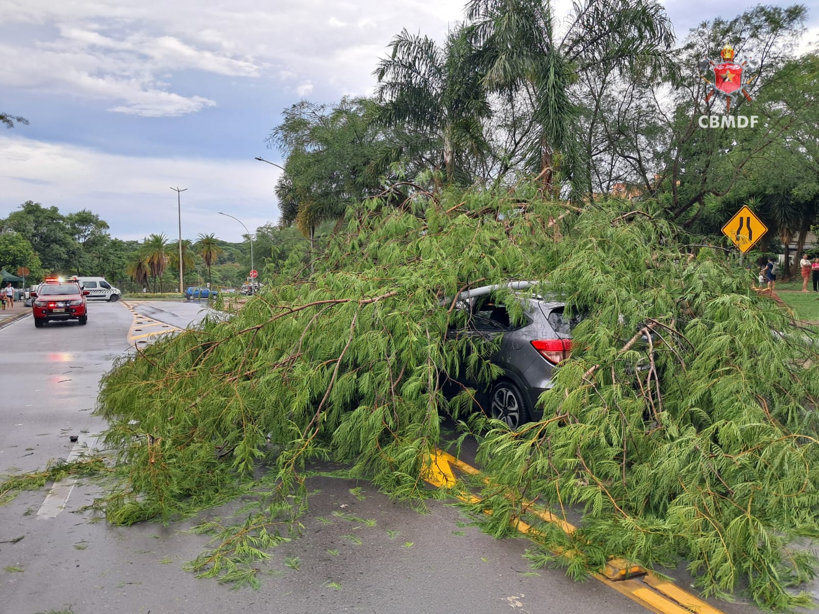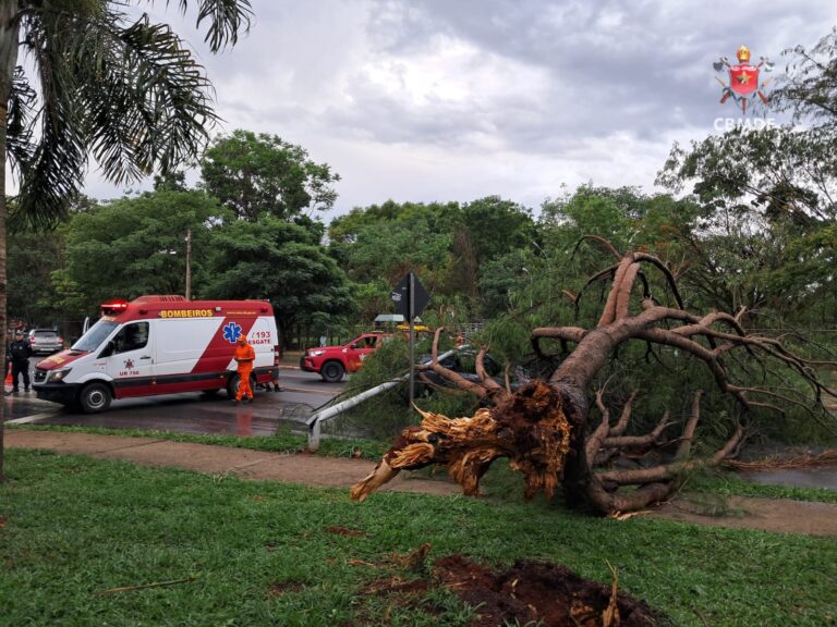 Uma árvore caiu e derrubou um poste de iluminação sobre um carro na SQS 214 Norte, em frente ao Parque Olhos D’Água, na tarde desta quarta-feira (05/11). A motorista precisou permanecer dentro do veículo até que a área fosse isolada com segurança, já que o poste havia permanecido energizado após a queda.