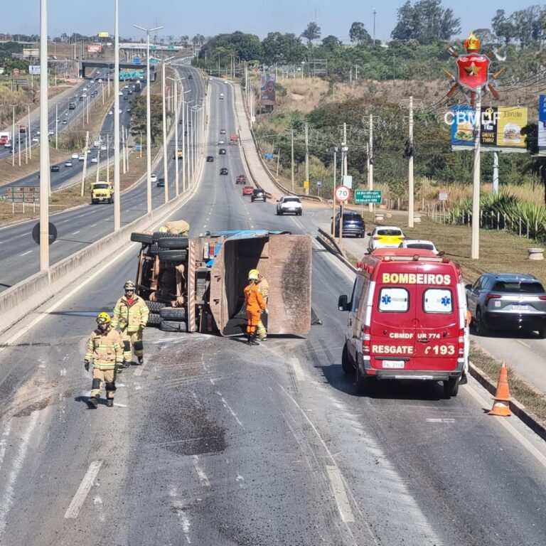 Um caminhão carregado com massa asfáltica tombou na via marginal da BR-020, na descida do viaduto do Taquari, sentido Brasília, nesta quinta-feira (24). O Corpo de Bombeiros Militar do Distrito Federal (CBMDF) atendeu à ocorrência mobilizando duas viaturas.