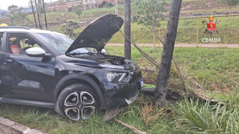 De acordo com o Corpo de Bombeiros Militar do Distrito Federal (CBMDF), no local, as equipes encontraram um Citroën C3 Aircross, de cor preta, que havia atingido uma árvore no canteiro central da via.