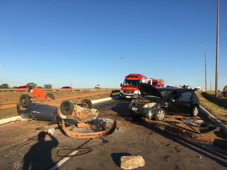 Nesta terça-feira (13), dois veículos colidiram e um deles capotou no viaduto que liga Samambaia ao Recanto das Emas, na BR-060.