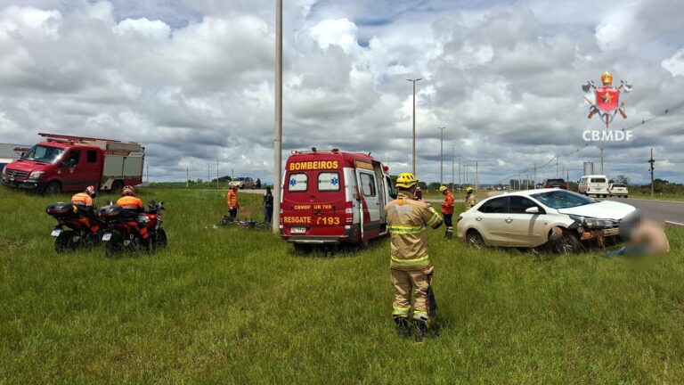 Uma colisão entre um carro e uma motocicleta deixou um homem ferido na manhã desta quinta-feira (05/02), na BR-070, em Ceilândia, no sentido de Águas Lindas de Goiás (GO). O Corpo de Bombeiros Militar do Distrito Federal (CBMDF) foi acionado.