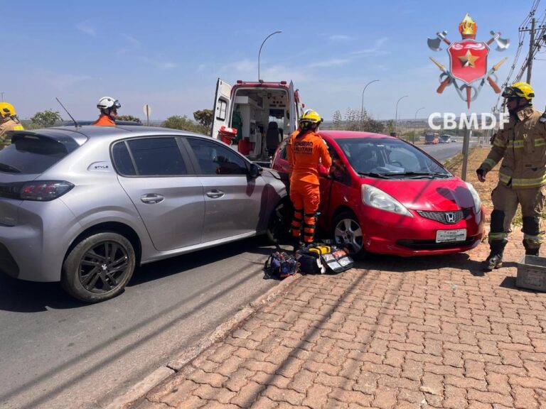 Três viaturas de resgate foram enviadas ao local para prestar atendimento às vítimas. De acordo com os bombeiros, o acidente envolveu um Honda Fit vermelho e um Peugeot 208.