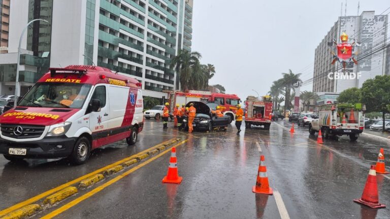 O Corpo de Bombeiros Militar do Distrito Federal (CBMDF) foi acionado e enviou três viaturas para o atendimento. No local, as equipes encontraram um Chevrolet Tracker e um Audi A5 Sportback, ambos de cor preta, que haviam se chocado.