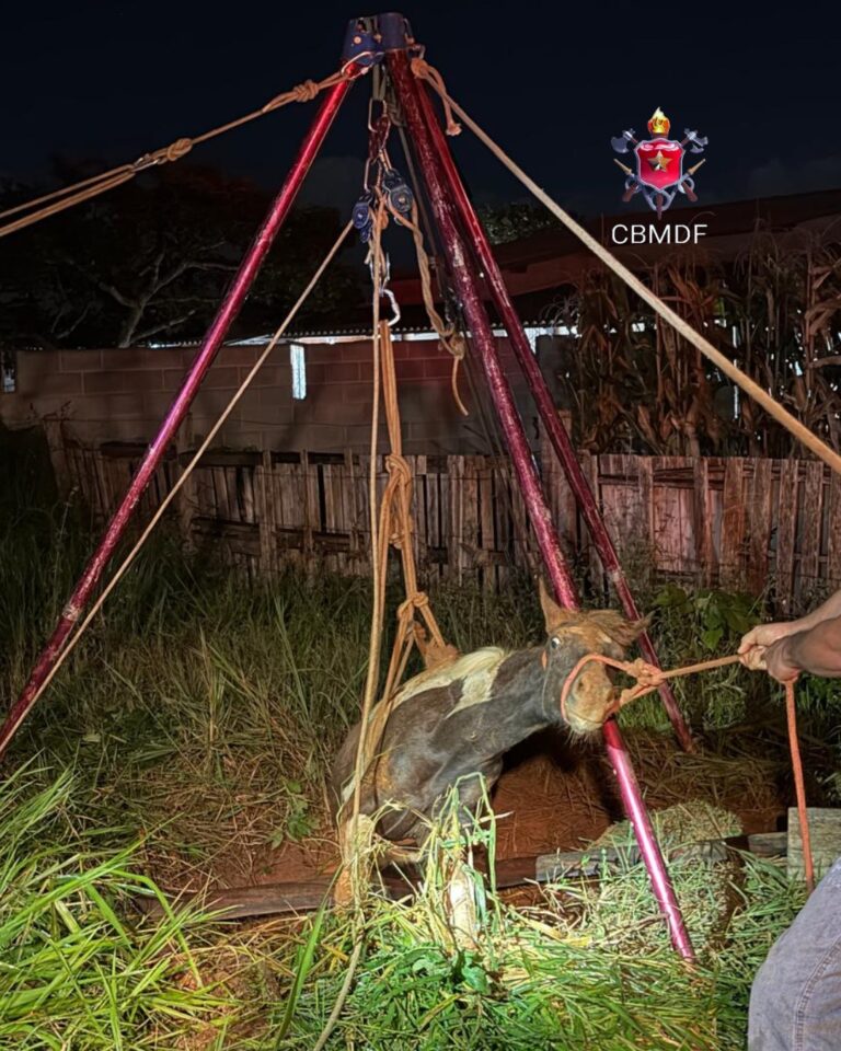 O Corpo de Bombeiros Militar do Distrito Federal (CBMDF) foi acionado às 20h16 e encontrou o animal dentro da estrutura, sem sinais aparentes de ferimentos. Para fazer a retirada, os militares montaram um sistema de resgate com tripé e multiplicador de força.