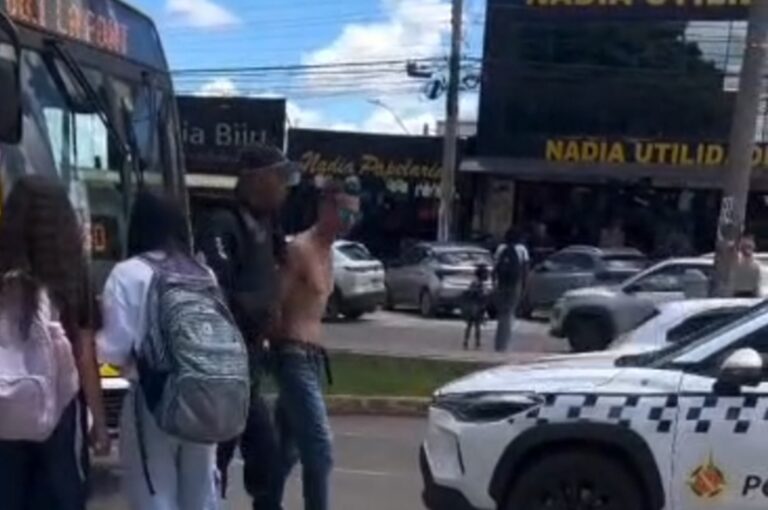 De acordo com testemunhas, o homem quebrou o vidro do veículo e tentou fugir após a ameaça. Ele acabou alcançado na parada da Quadra 29, onde foi contido até a chegada da PM.