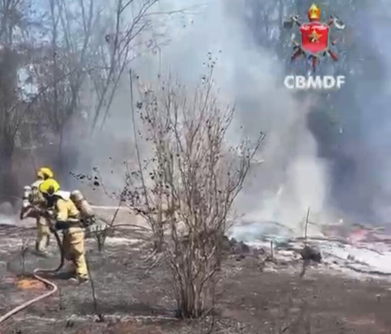 O Corpo de Bombeiros Militar do Distrito Federal (CBMDF) foi acionado para conter o incêndio e mobilizou cinco viaturas, com aproximadamente 15 militares atuando em várias frentes.