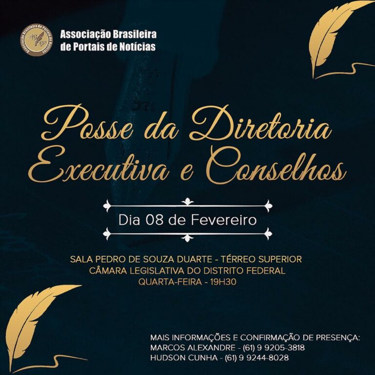 A Associação Brasileira de Portais de Notícias – (ABBP) empossará sua nova diretoria na próxima semana. O evento será realizado na quarta-feira, dia 8 de fevereiro, às 19h30, na Sala Pedro de Souza Duarte, Térreo Superior, da Câmara Legislativa do Distrito Federal.