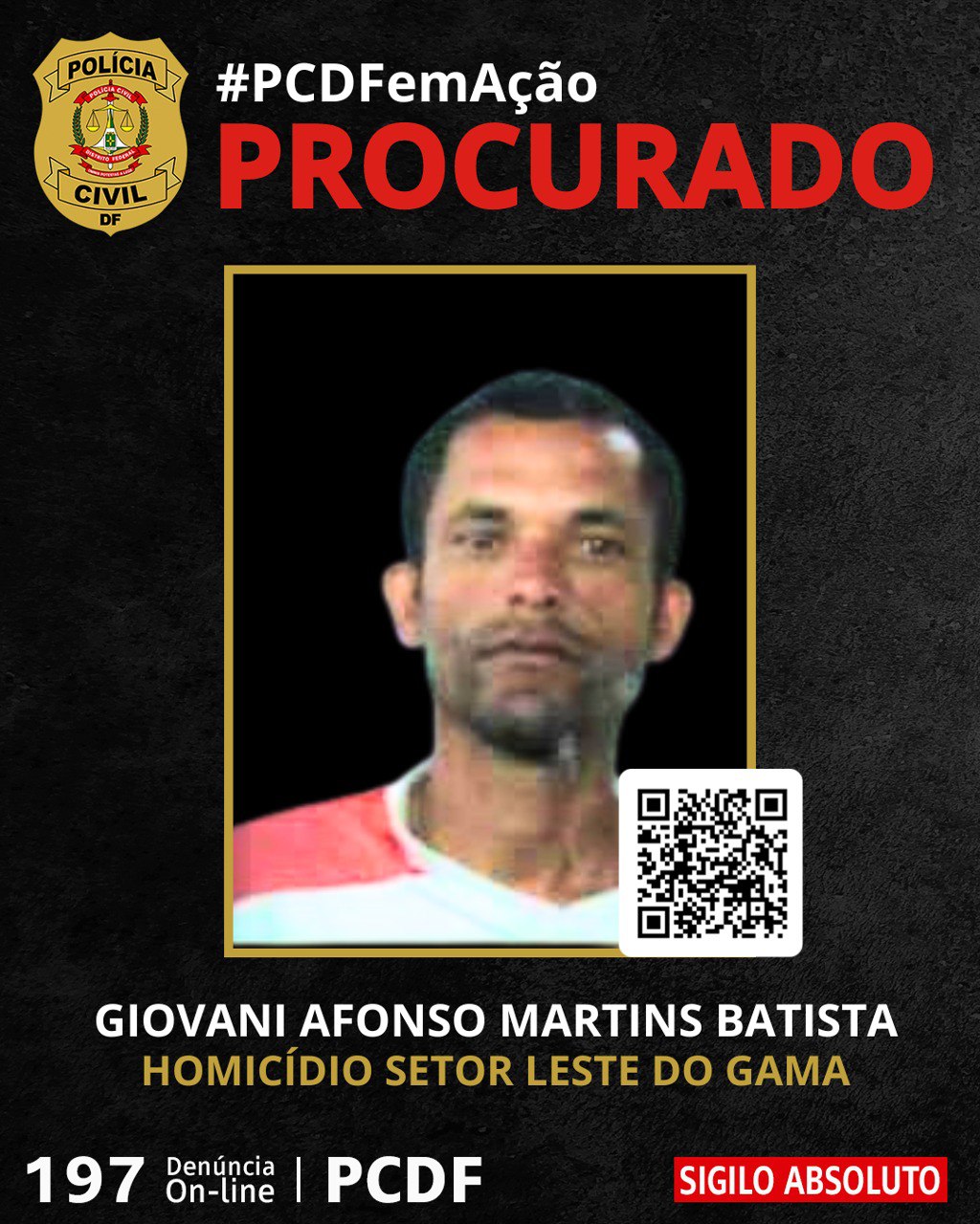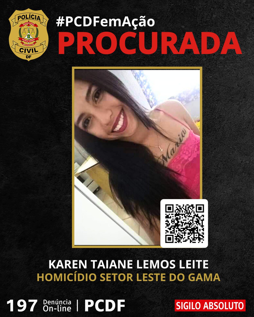 A Polícia Civil do Distrito Federal (PCDF), por meio da 14ª DP, solicita a colaboração da população para localizar Giovani Afonso Martins Batista e Karen Taiane Lemos Leite, acusado de crime de homicídio ocorrido no dia 3 de maio deste ano, no Setor Leste do Gama. O crime foi praticado com extrema violência, mediante golpes de faca, e a vítima foi encontrada carbonizada.