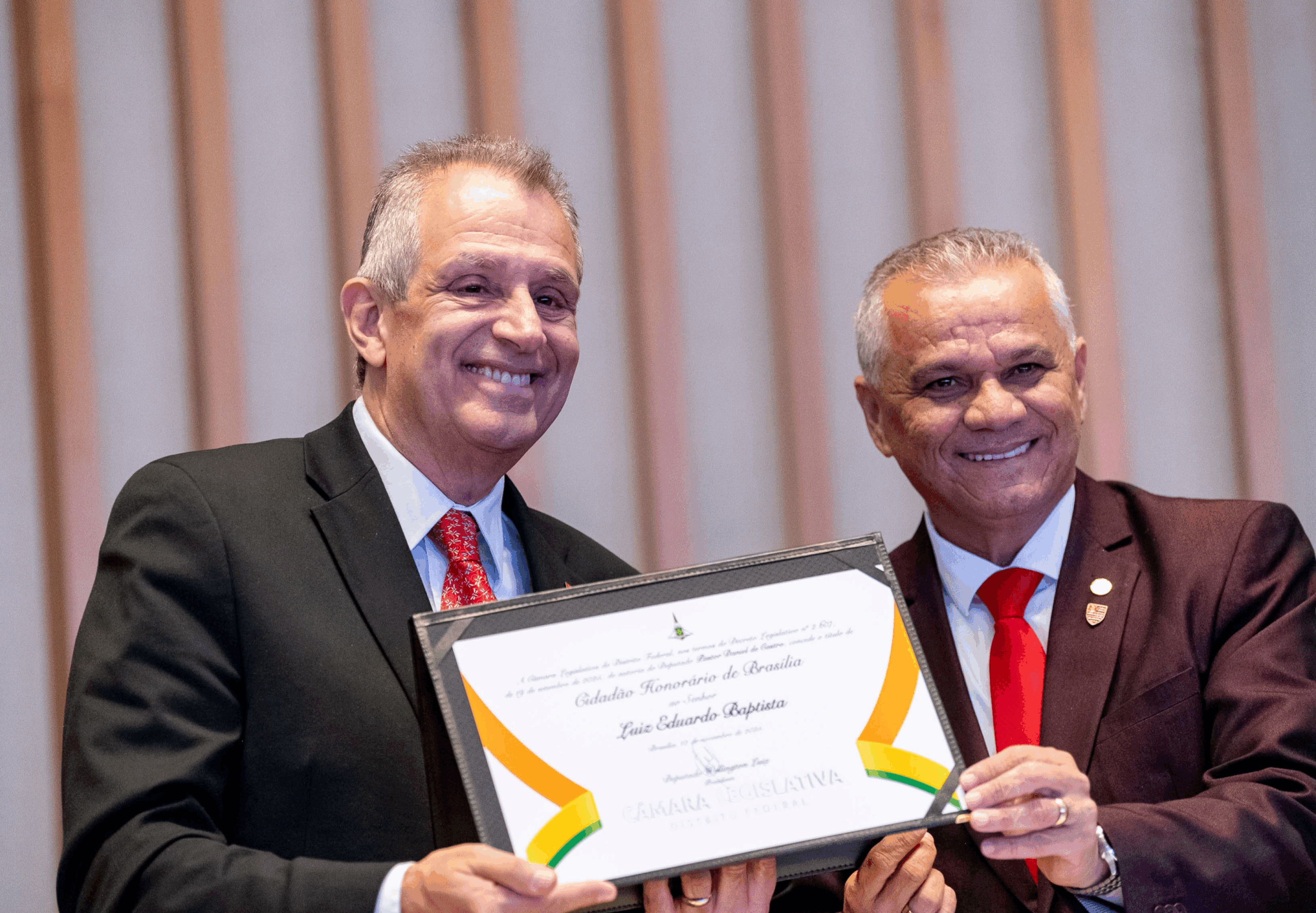 O plenário da Câmara Legislativa do Distrito Federal recebeu uma multidão vestida de vermelho e preto, na manhã desta quarta-feira (12), para prestigiar a entrega do Título de Cidadão Honorário de Brasília ao presidente do Clube de Regatas do Flamengo, Luiz Eduardo Baptista, mais conhecido como Bap. A cerimônia também celebrou os 130 anos do clube carioca, fundado em 15 de novembro de 1895.