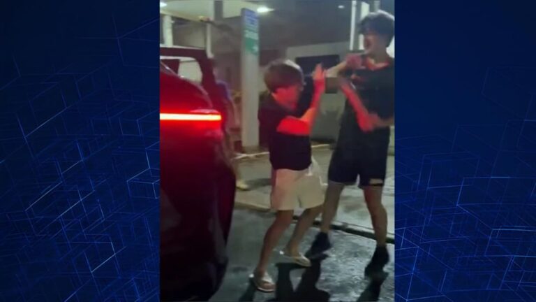 Imagens que circulam mostram os dois envolvidos trocando chutes e socos. Em um dos momentos mais graves, o adolescente leva um soco no rosto, cai e bate a cabeça em um carro. Mesmo aparentando perder as forças, ele ainda sofre novas agressões até que amigos intervenham e o retirem do local.