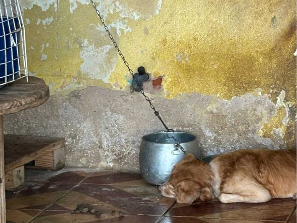 De acordo com a investigação, o cachorro vivia preso por uma corrente curta, sem conseguir se movimentar direito. O ambiente tinha acúmulo de fezes, água suja e o alimento estava fora do alcance do animal. Um segundo cachorro também foi encontrado dentro da casa, em meio à sujeira.