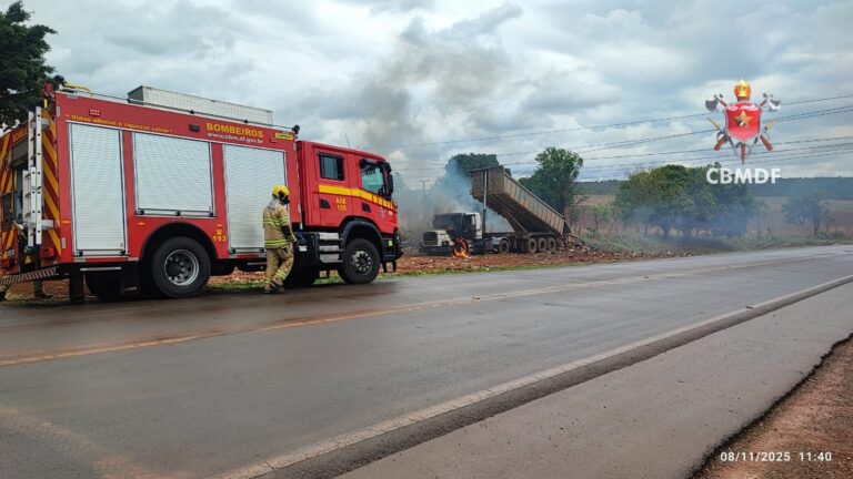 Um caminhão ficou completamente em chamas na manhã deste sábado (08/11) após encostar em fios de alta tensão na DF-230, próximo ao viaduto de acesso à Formosa (GO). O incêndio assustou motoristas que passavam pela via e causou interdição parcial do trânsito.