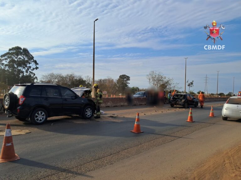O Corpo de Bombeiros Militar do Distrito Federal (CBMDF) foi acionado e enviou três viaturas ao local para o atendimento. No ponto do acidente, os militares encontraram um Chery Tiggo preto, um VW Gol preto e um Toyota Corolla cinza com danos na parte frontal e traseira, caracterizando uma colisão em sequência.