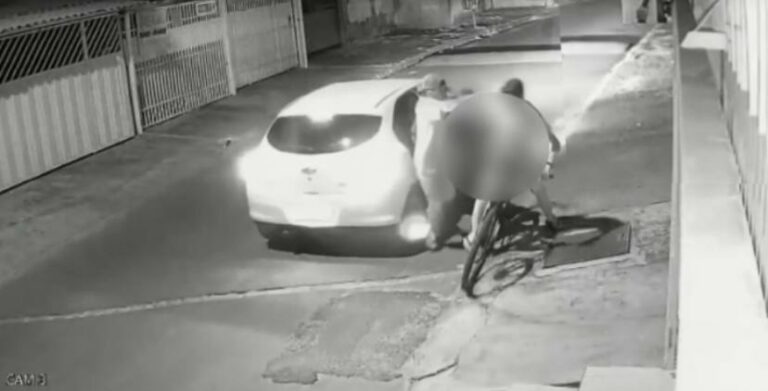 Câmeras de segurança flagraram o momento em que um dos assaltantes desce do carro com um facão e agride a vítima, para roubar a bicicleta. Em seguida, o jovem se afasta e o assaltante tenta colocar a bicicleta no carro. Outro criminoso desce do veículo, mas não consegue ajudar o comparsa. Nesse momento, a vítima volta, pega a bicicleta e foge, e os assaltantes vão embora no carro. Porém na hora em que a vítima tenta fugir seu celular cai, e o aparelho é levado pelos criminosos.