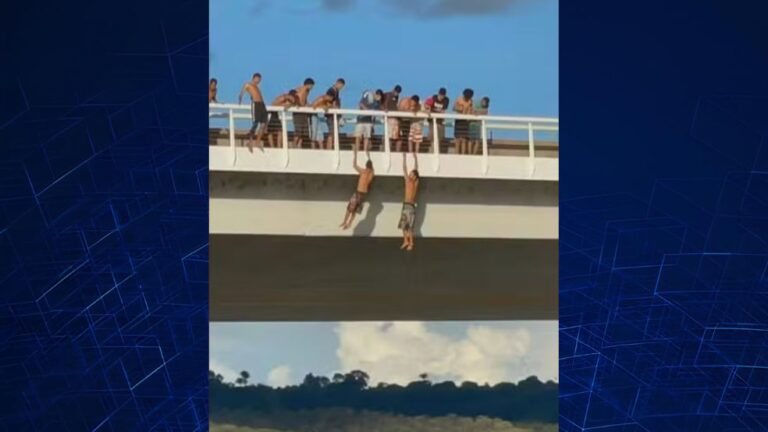 Um grupo de jovens foi flagrado se arriscando ao pular da Ponte JK, no Lago Paranoá, em Brasília, no último domingo (5). Imagens mostram alguns deles pendurados na estrutura, enquanto outro se equilibra no corrimão antes de saltar na água.