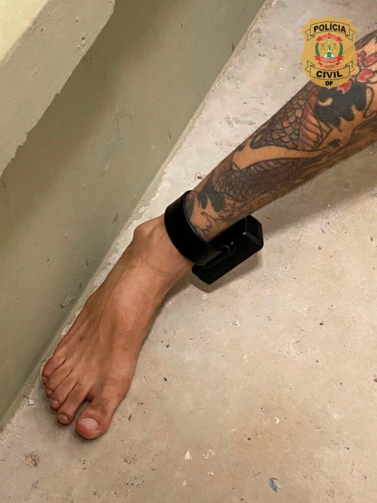 O criminoso utilizava tornozeleira eletrônica, uma vez que havia sido beneficiado, em setembro de 2025, com liberdade provisória, cumulada com prisão domiciliar.