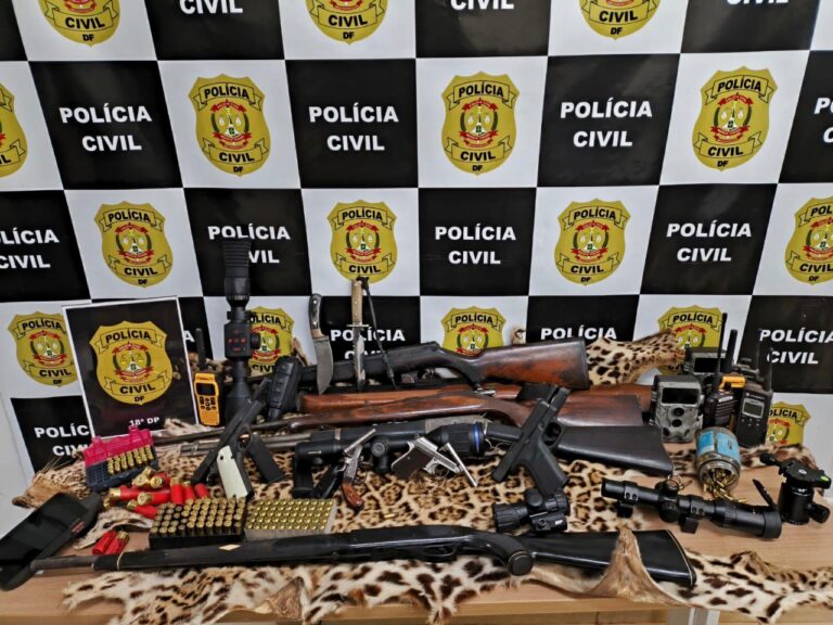 Dois mandados de busca foram cumpridos: um em uma fazenda às margens da BR-080, em Brazlândia, e outro em uma residência em Vicente Pires. As armas — quatro espingardas, dois revólveres e duas pistolas — estavam na fazenda, junto com munições, acessórios e até um couro de onça-pintada.