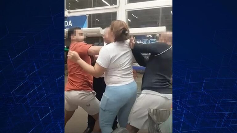 O episódio foi registrado por pessoas que estavam no local e mostra uma briga generalizada entre os envolvidos. Nas imagens, a mulher aparece participando ativamente da discussão, com empurrões e agressões, enquanto dois homens trocam tentativas de ataque em meio ao tumulto.