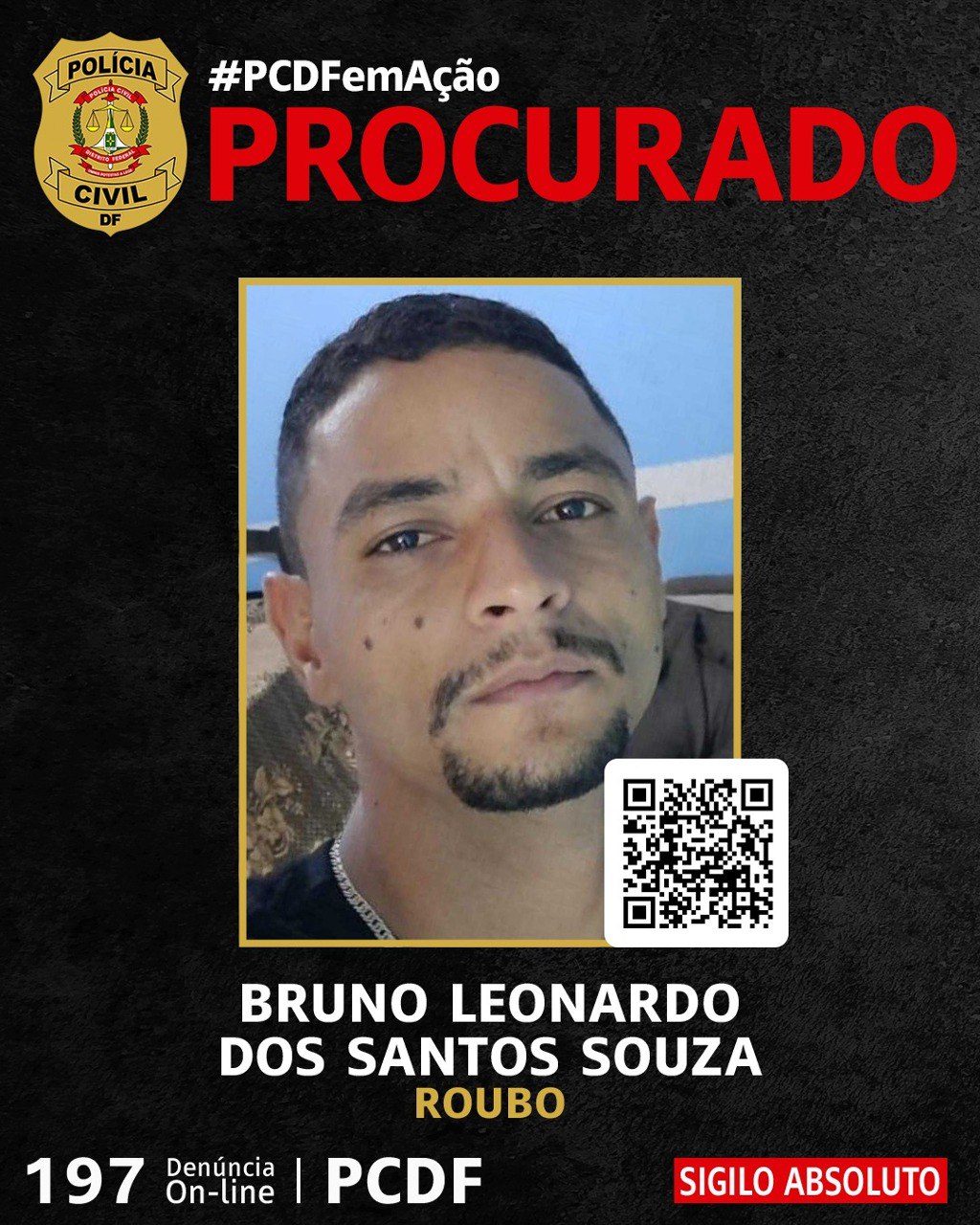 A foto de Bruno Leonardo foi divulgada pela PCDF para auxiliar na sua captura. A equipe de investigação da 16ª DP pede que, caso alguém tenha informações sobre o paradeiro do foragido, entre em contato pelo telefone Disque- Denúncia (197), canais online de denúncia no site da PCDF, ou mesmo procure a delegacia mais próxima para informar sobre o criminoso.